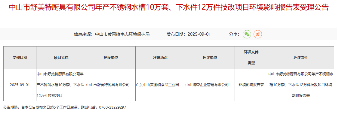 2025年9月1日,中山市黃圃鎮(zhèn)生態(tài)環(huán)境保護局受理中山市舒美特廚具有限公司年產(chǎn)不銹鋼水槽10萬套、下水件12萬件技改項目環(huán)境影響報告表并對外進行公告,公告期:5個工作日。