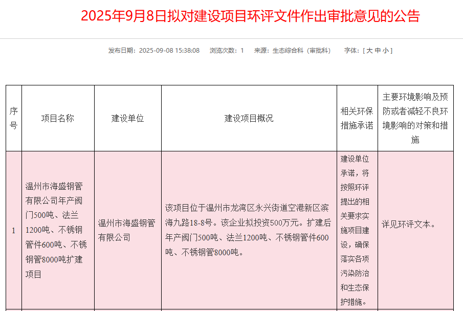 2025年9月8日,溫州市生態(tài)環(huán)境局龍灣分局就溫州市海盛鋼管有限公司年產(chǎn)閥門500噸、法蘭1200噸、不銹鋼管件600噸、不銹鋼管8000噸擴(kuò)建項(xiàng)目環(huán)境影響評價報(bào)告表作出審批意見并對外進(jìn)行公告,公告期:5個工作日。