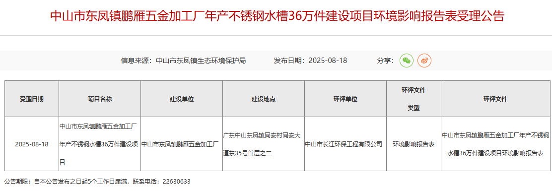 2025年8月18日,中山市東鳳鎮(zhèn)生態(tài)環(huán)境保護局受理中山市東鳳鎮(zhèn)鵬雁五金加工廠年產(chǎn)不銹鋼水槽36萬件建設(shè)項目環(huán)境影響報告表并對外進行公告,公告期:5個工作日。