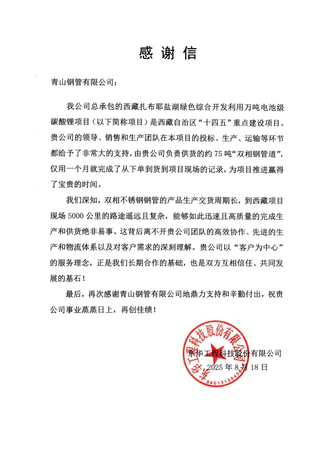 近日,青山鋼管有限公司收到東華工程科技股份有限公司發(fā)來的感謝信,對公司在西 藏扎布耶鹽湖綠色綜合開發(fā)利用萬噸電池級碳酸鋰項目中的卓越表現(xiàn)予以高度肯定。