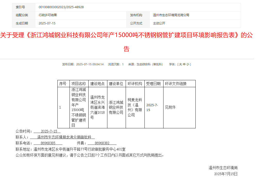 2025年7月15日,溫州市生態(tài)環(huán)境局受理浙江鴻城鋼業(yè)科技有限公司年產(chǎn)15000噸不銹鋼鋼管擴(kuò)建項(xiàng)目環(huán)境影響報(bào)告表并對(duì)外進(jìn)行公告,公告期:7個(gè)工作日。